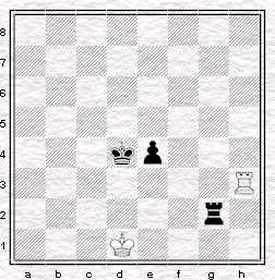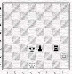 La première position présentée est donc la fameuse position de Philidor. La tour du défenseur, ici les blancs, est sur la 3ème (ou 6 ème) rangée et le roi devant le pion de l'adversaire. Les noirs ne peuvent pas progresser car la poussée 1... e3 serait contrée par 2. Th8! avec une pluie d'échecs à venir, le roi noir n'ayant plus d'abri.