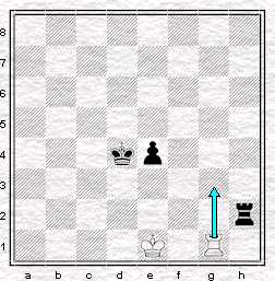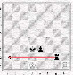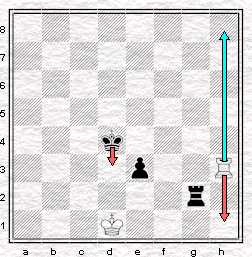 Sur le 3ème diagramme, on note que le pion e noir a été avancé sur la 3ème rangée. Les blancs au trait feraient nulle, comme nous l'avons vu sur le premier diagramme en transférant leur tour sur la 8ème rangée (flèche bleue). Si les noirs ont le trait en revanche, le roi a le temps d'arriver sur la 3ème rangée, protégé par le pion et les blancs sont contraints de ramener leur tour sur la première rangée pour parer le mat (flèches rouges). On arrive sur la position du 2ème diagramme avec une tour dite passive.
